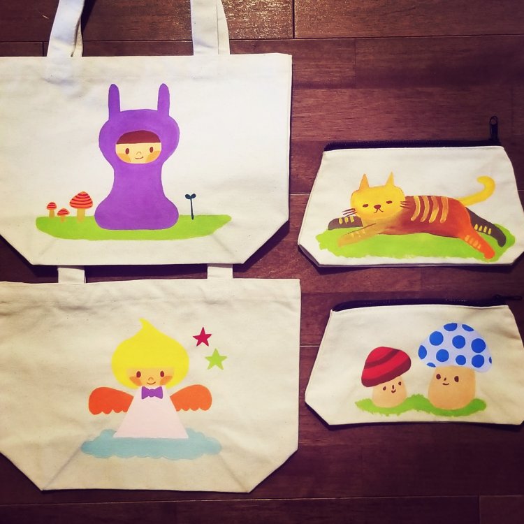 完成しているのはこの4つ。小さいトートバッグ2つとポーチ2つです。まだ途中ですが、大きいトートバッグ、コサッシュにも描いています。