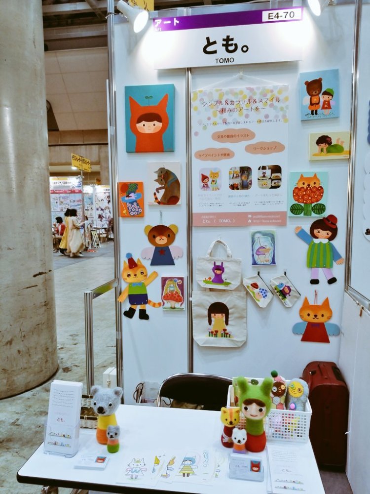 昨年までの反省から、やりたいことを具体的に書いたパネルをメインに掲示し、キャンバスのアクリル画だけでなく水彩画やベニヤ板、トートバッグなど色んなパターンの作品を展示しました。手芸雑貨も用意して絵描き以外のこともアピールしてみました。
