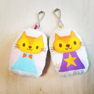 クッションキーホルダーは、布にアクリル絵の具でイラストを描いて小さいクッションを作りボールチェーンをつけてキーホルダーにしました。