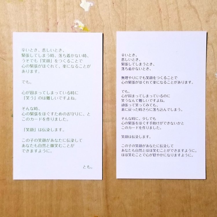 昨日ですが、新しいほほえみカードを置いてきました。前のデザインはほとんど残っていなかったので、同じデザインで再印刷するよりデザインを変えようと。