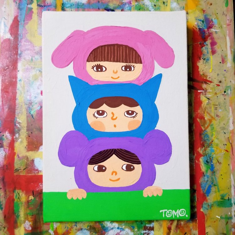 作品はサムホールサイズのキャンバスで縦向きに統一された平面作品と、立体作品とがあります。