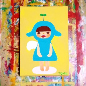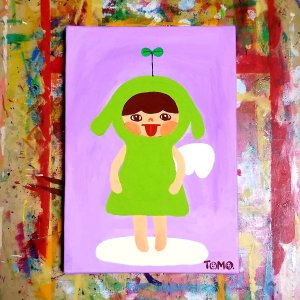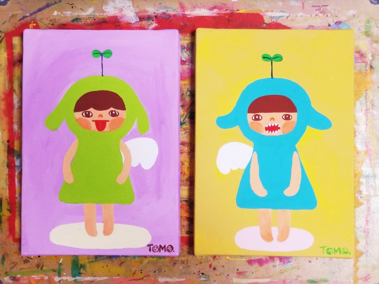 いつも描いている天使は、ハートとかお花とか猫を持って、にっこり笑っているんですが、今回はあえて笑わず、舌を出したり歯をむき出しにしたりしてみました。