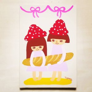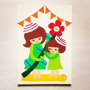 二人で持てそうな長いもの、で浮かんだのが花と鉛筆とバケットだけでして、、、どんぐり帽子の子たちに花を持たせたのできのこ帽子は、、、と選択したのがバケットでした。