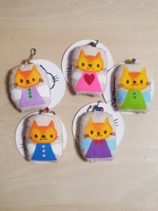 表面は無地にアクリルガッシュで描いた猫天使、裏面はそれぞれ違う柄のプリント生地になっています。