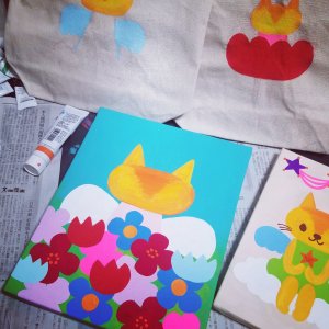 これは、トートバッグやキャンバスの制作途中の写真です。
