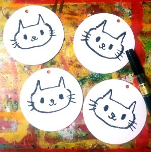 紙コースターにレザーパンチで紐通しの穴を開け、筆ペンで猫の顔を描いたものです。