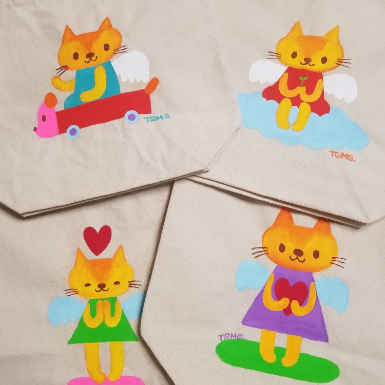 猫天使のトートバッグはデサフェスでも販売しようかと他の制作と並行して少しずつ描いていたところだったので、4点だけ在庫があり、