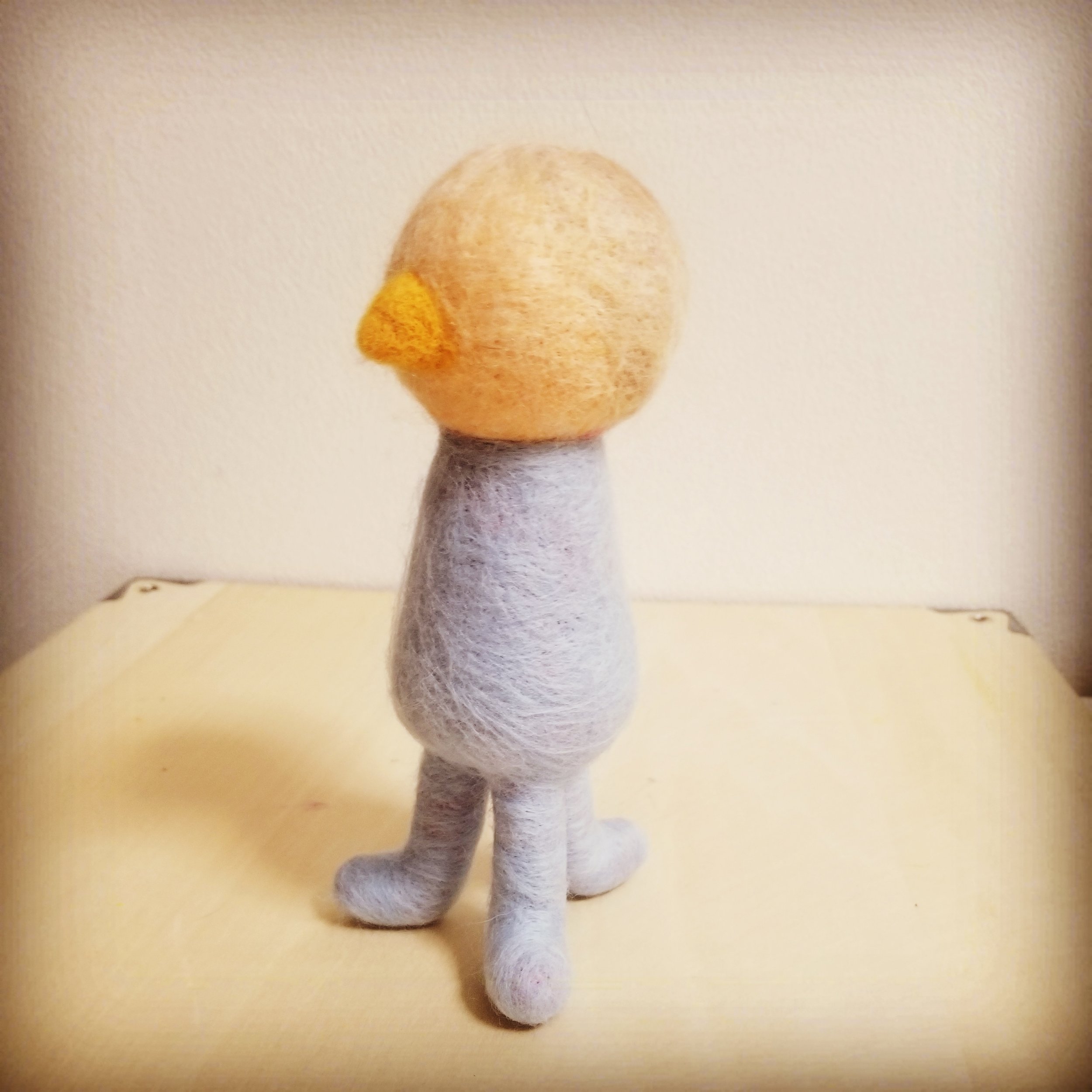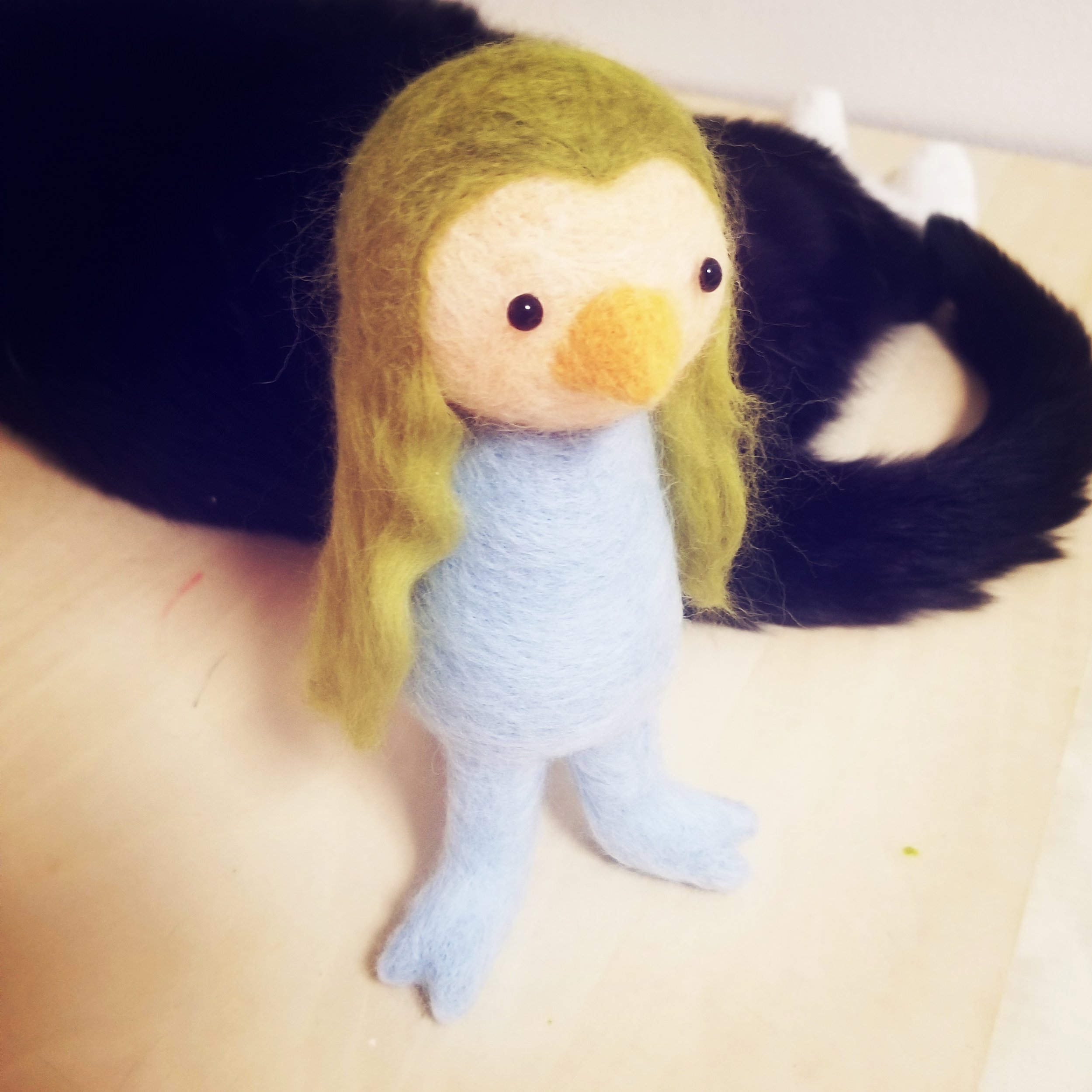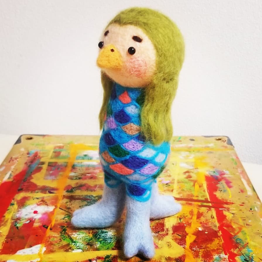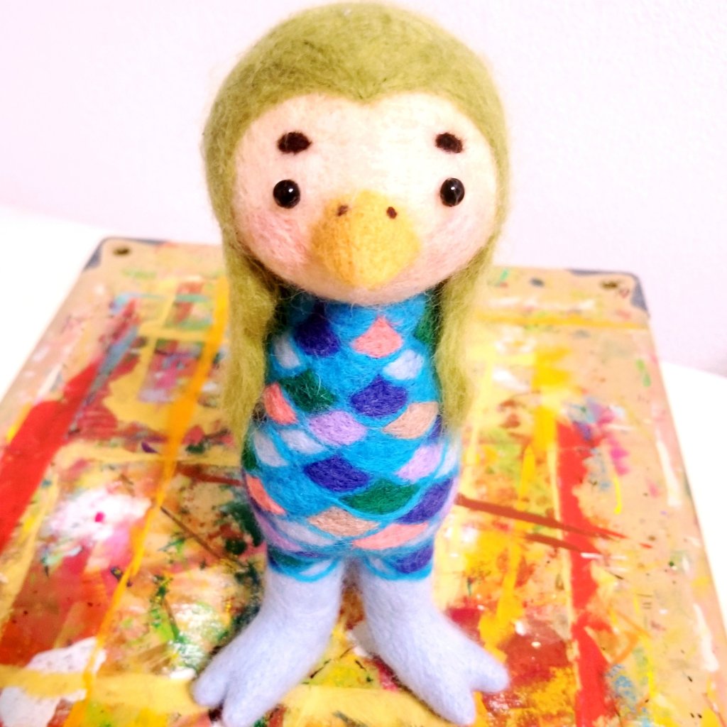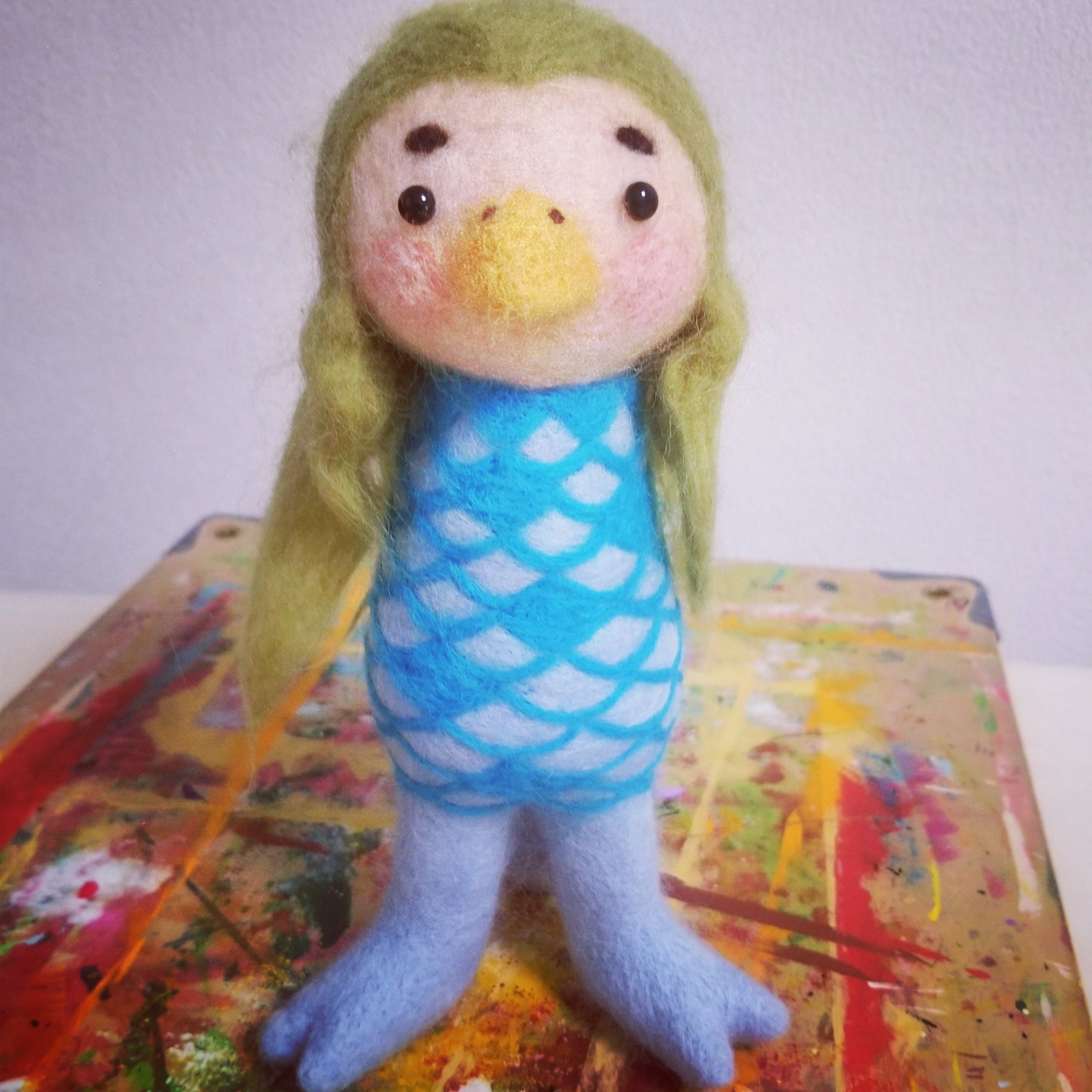 フェルトを細くよって、ウロコ模様を描いていったのですが、網にかかった様にもニットワンピを着てる様にも見えてしまって、どうしようかなと困りました(苦笑)