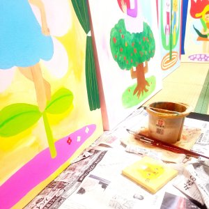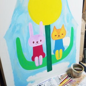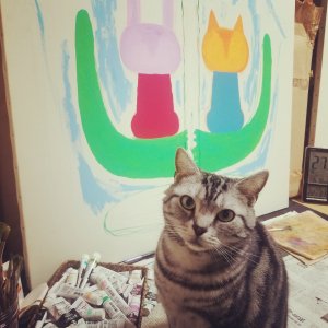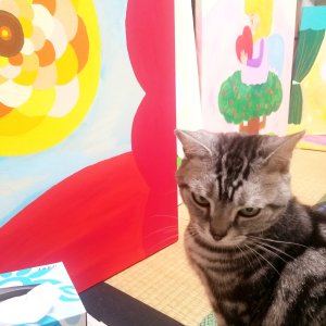 猫に見守られながら、少しずつ完成させていったアクリル画が四点。他に、羊毛フェルトの人形一点もありました。