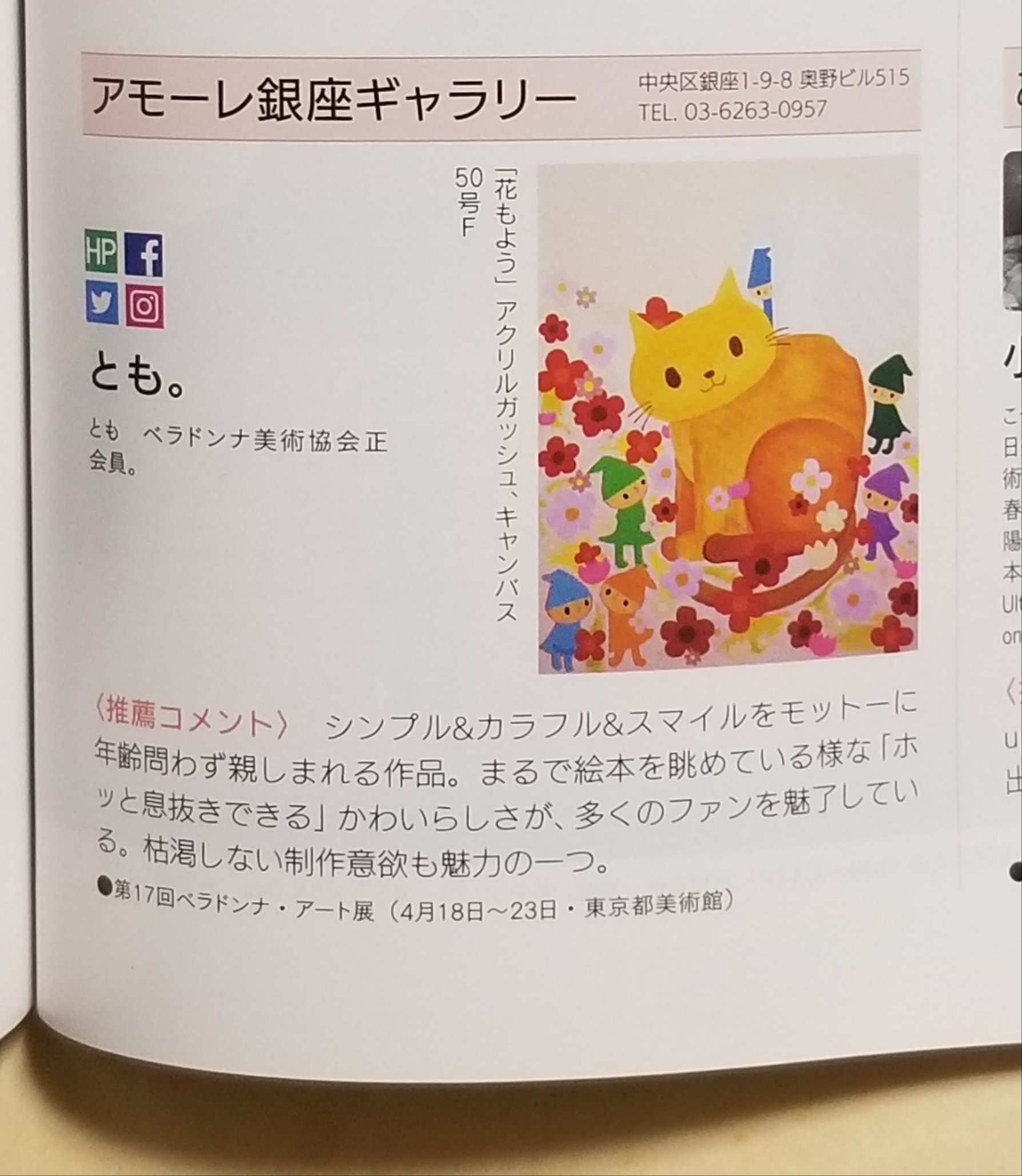 なんと、美術雑誌『美術の窓』の5月号の「画廊が選ぶ注目の新人65」にて、アモーレ銀座ギャラリーの推薦として紹介して頂きました。