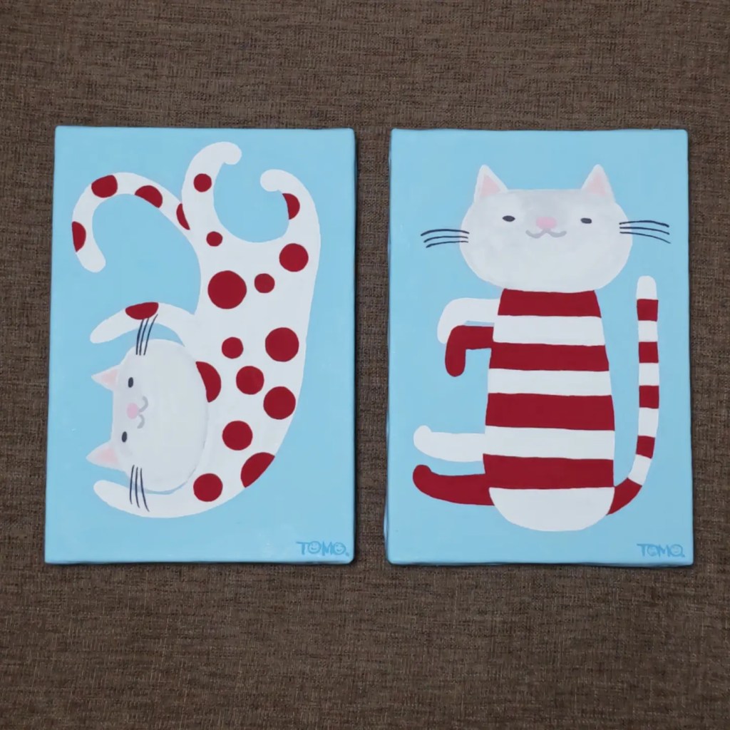水玉の猫とシマシマの猫を描きました。結構“いい顔”の猫になったなと気に入っています。