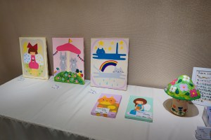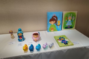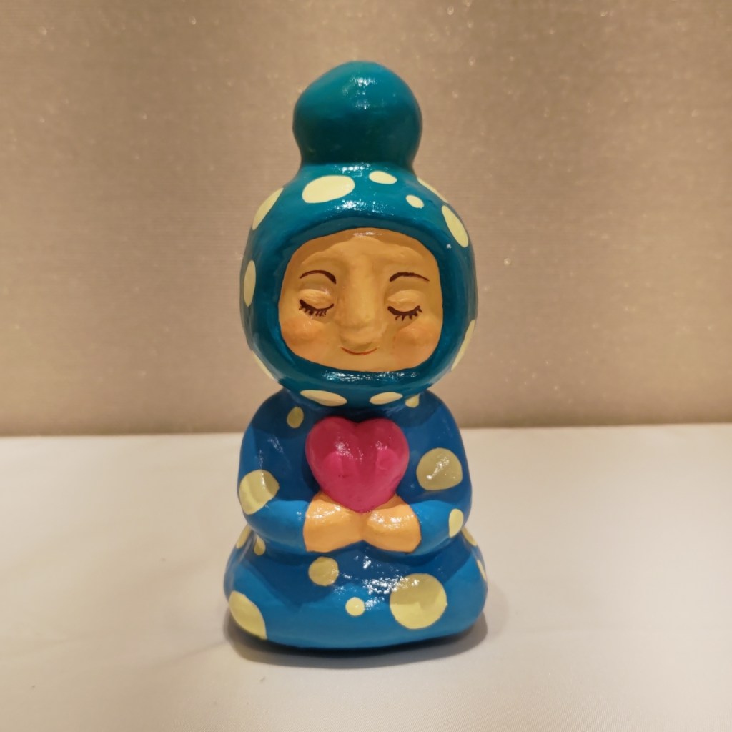 石粉粘土の人形はこの3つ。緑のキノコはまだニスを塗ってないので展示後にやらないと。