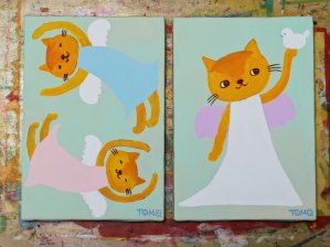 “愛”も“夢”も平穏な世界で生まれてくるものだと思いまして、自由で呑気な猫天使たちを描いてみました。