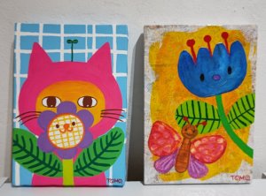 二点とも“元気な花”をモチーフに、1つはいつもと同じように「キャンバス、アクリル画」で、もう1つは「木製パネル、コラージュ、アクリル絵の具、ニス仕上げ」で、制作しました。