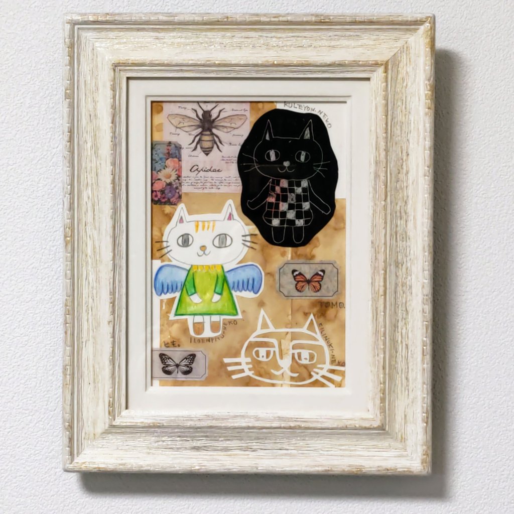 コラージュの方は、猫のクレヨン画・色鉛筆画・切り抜き画と、コーヒー染めした紙と、虫と花のシールをバランスを見て並べています。