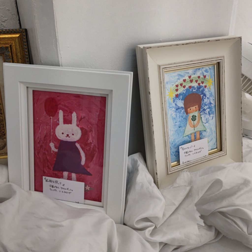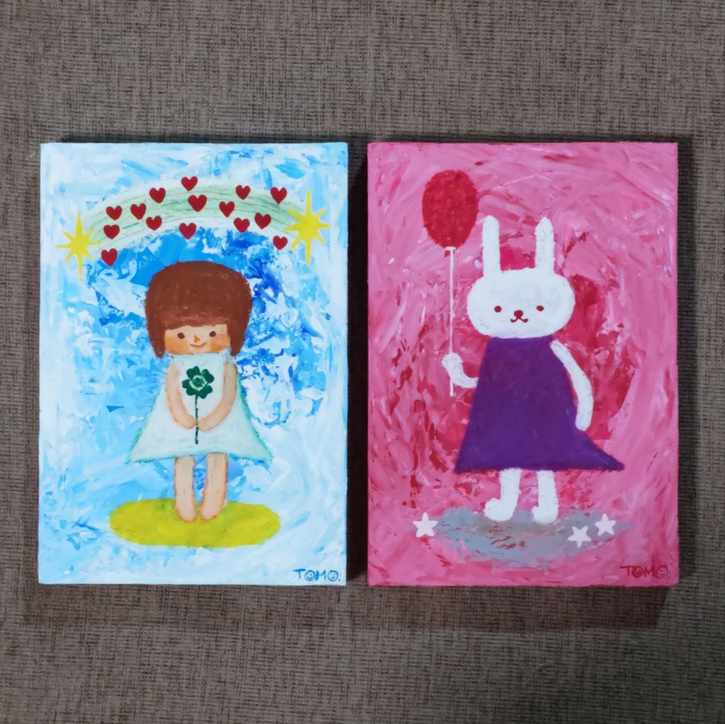 木製パネルにアクリルガッシュとクレパスで描き、表面をニス仕上げにしています。