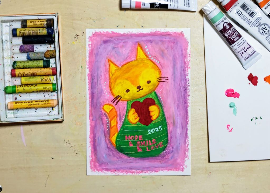 今年もほほえみカードを作るため、2025年用のイラストを描きました。メインはパステルを使用し、細かいところはアクリル絵の具を使いました。