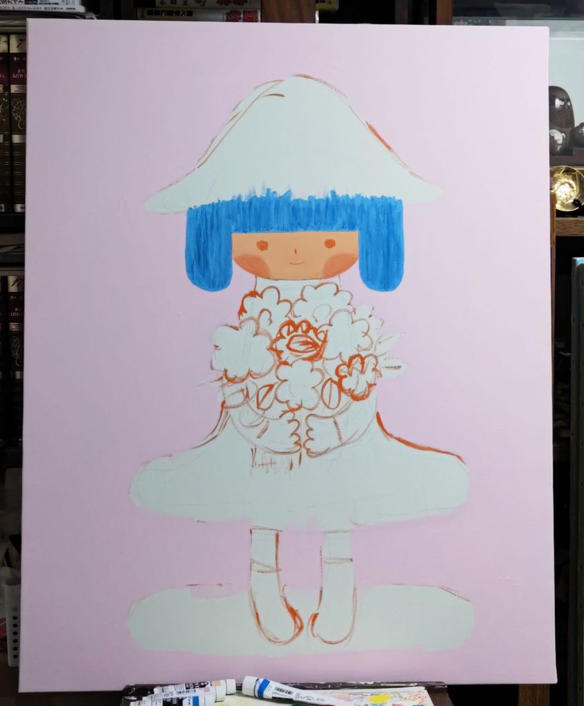 花を塗っている時に「花を抱えている」のではなく「花束を渡そうとしているところ」にしようと思いつき、手の角度や花束の感じを少し変更しました。