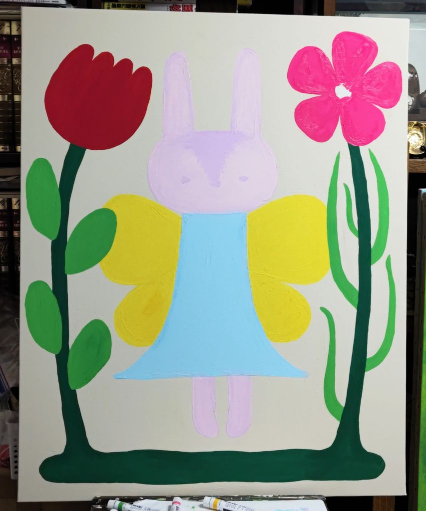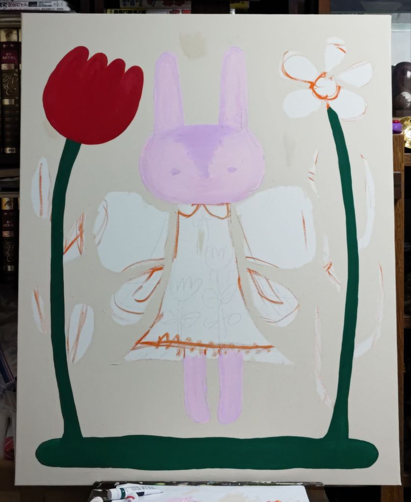 改めて下書きしてあるキャンバスを眺めていた時に「ネコは『ごろんちょ』で描いているしなぁ」と思い、ネコからウサギに変更することにしました。更に、この子だけだと何か寂しく見えたので花を添えてみました。