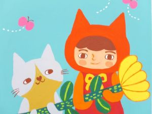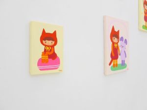 去年出展予定だった作品や一昨年参加した時の作品では、全部違う雰囲気になるようにモチーフや構図など被らないように制作したのですが、今回はこの赤い猫耳頭巾の子を共通モチーフにして制作しました。